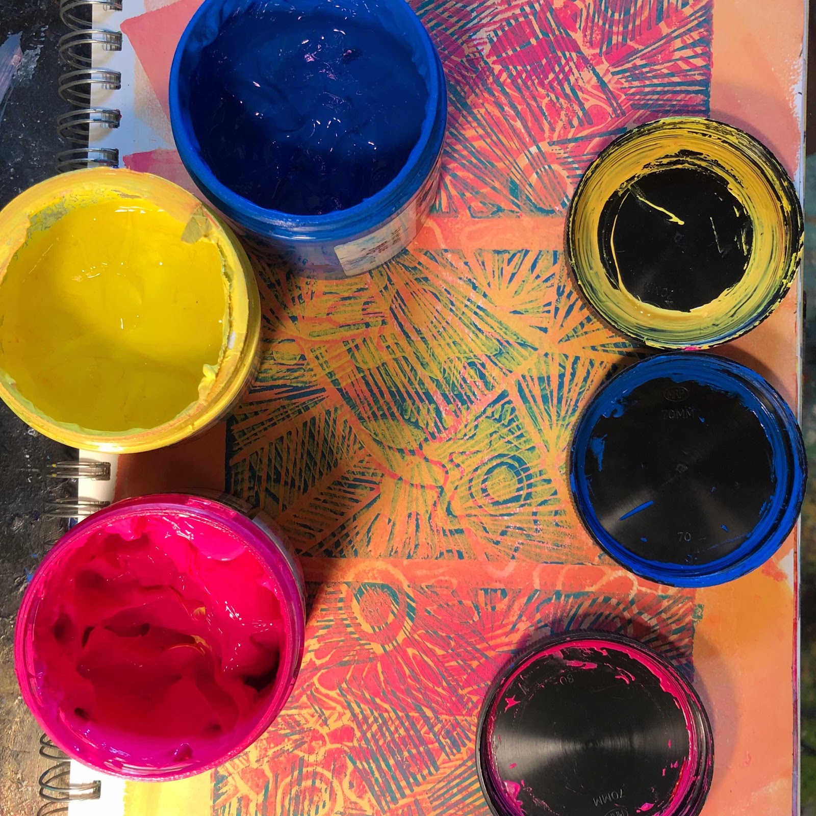 Aren’t these colors gorgeous? ❤️ I carve linoleum blocks (not pictured - sorry!). Once they’re done I roll on the ink!