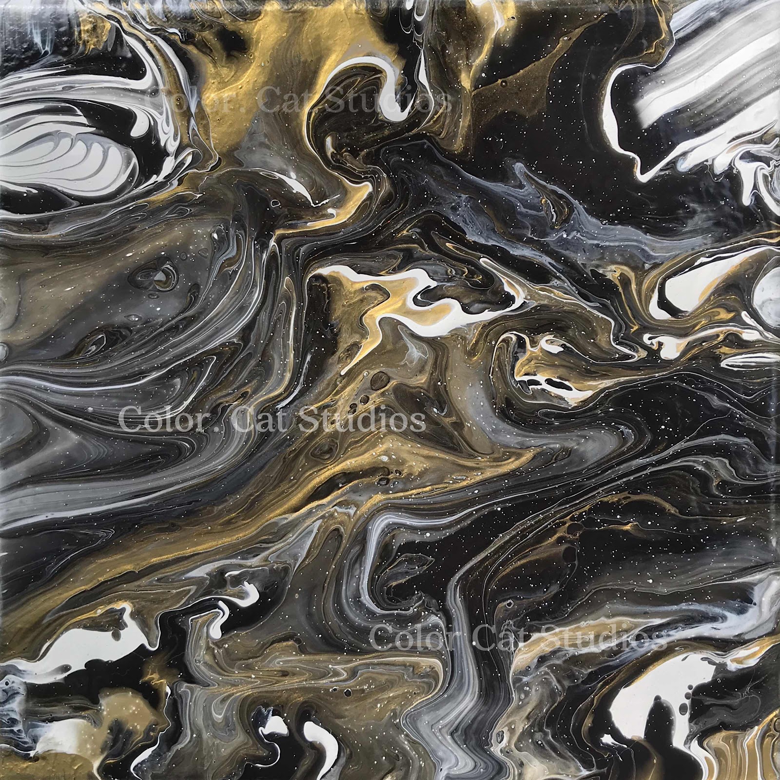 This is my painting ‘Dragons Among Us.’ I’ve got three dragons hidden within the depths of space... can you find them? I just posted it on my site, www.colorcatstudios101.etsy.com for a mere $90.00. Christmas is coming, people. Once this is gone, it’s gone. These paint pours are what I’d call controlled chaos - I can control them to an extent, but they also have a mind of their own and that’s what makes them so special. Let’s take a look at this one: Here’s the entire painting.