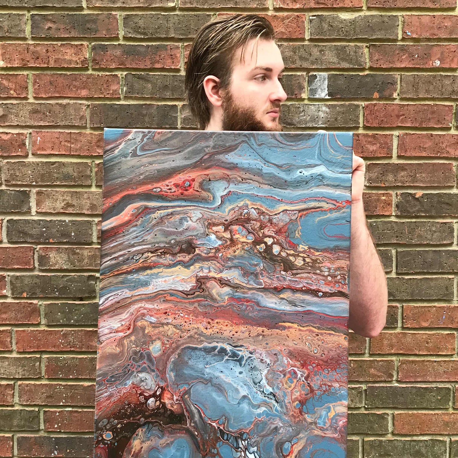 I’m really happy with this piece and love the way the cells formed (a pouring artist’s goal). The cool colors are so calming they remind me of water and that little pop of hot red gels the entire work. I love it!