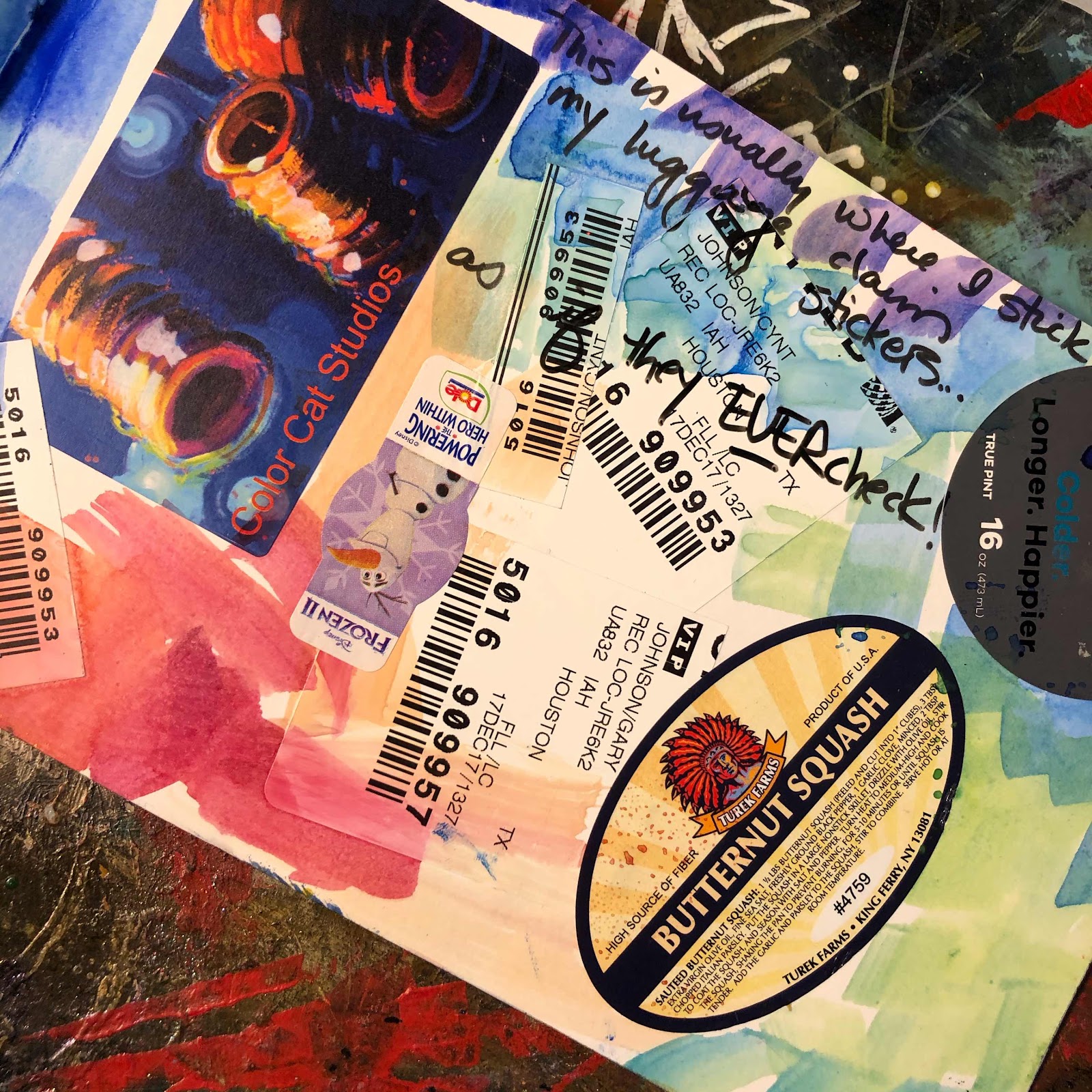 Often I will fashion a little pocket out of some kind of little bag to keep ticket stubs in and glue it inside the back cover. I’ve used barf bags from airplanes and tampon bags from ladies’ restrooms. Every time I open to those I laugh!